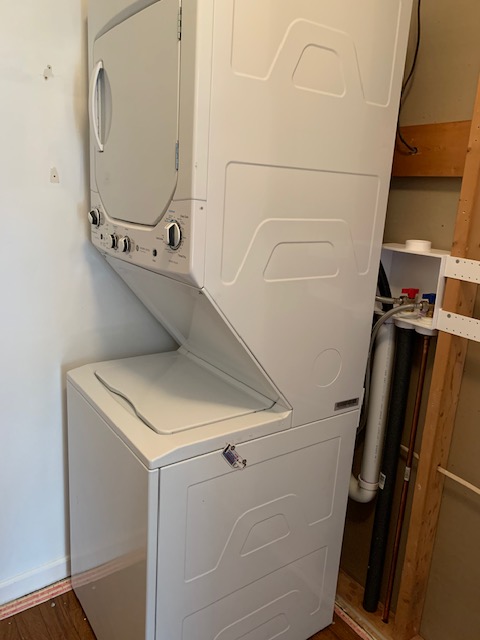 Back to the point. In just a few hours, Keith moved plumbing to our master closet, and put in the new electrical for the dryer. He then disconnected the old washer and dryer and we (yes, I helped with this) moved the old washer and dryer out of the house, over the yard, down the very steep driveway and into the garage. We are keeping them as one day we may want to put more laundry down in the basement. He then connected up our new unit and I’ve already done three loads of laundry in it. Woo hoo! We do still need to put up the drywall behind it but didn’t have all of the right supplies. We’ll probably have our handyman help with that. Here are a few pictures…