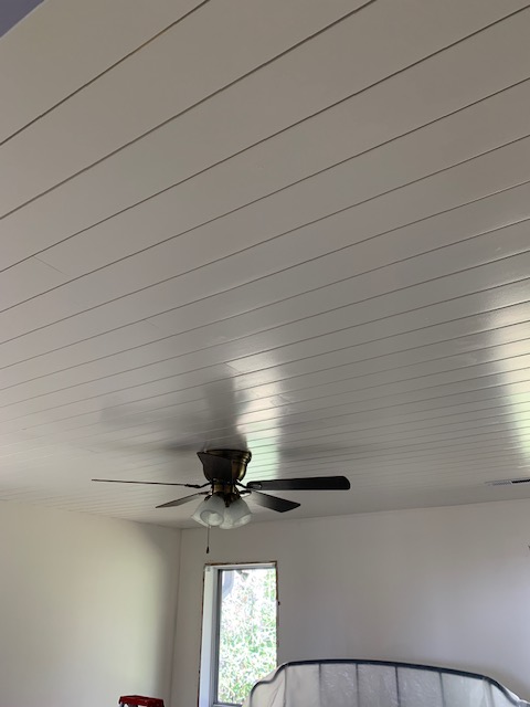 Kevin and his helper also put shiplap up on our ceiling in the master bedroom. Keith & I are perfectly capable of doing that ourselves, but it’s time consuming and it was just faster to have them do it. And they did a beautiful job! I think the pictures tell it all. Here’s the before…