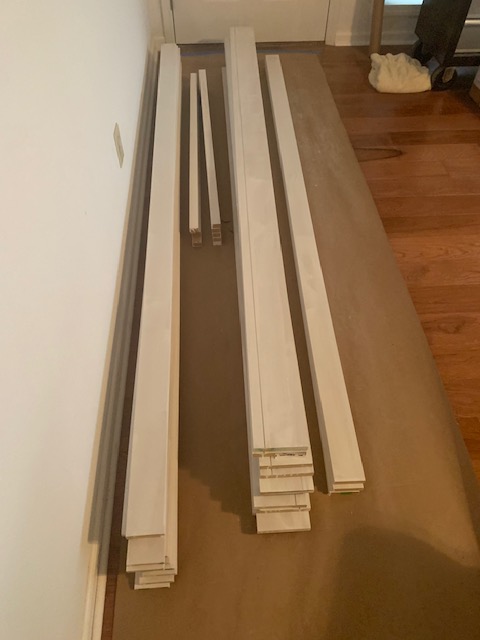 Before Keith painted the ceiling, we took down ALL of the trim (baseboards, window trim, door trim) and then we milled the groove in our new baseboards and cut some extra trim for above our doors and windows. Then, while Keith was busy painting the ceiling and exhausting himself, I was outside working and praying it wasn’t going to start raining on me. I mentioned before that we have milled our own trim out of MDF for the house. It’s cheaper and allows us to get exactly what we want. But it does require more work. It required me to sand down each piece so that the cut edges would be smooth and then I had to prime all of the pieces. That’s no small task for 200ish linear feet of trim.