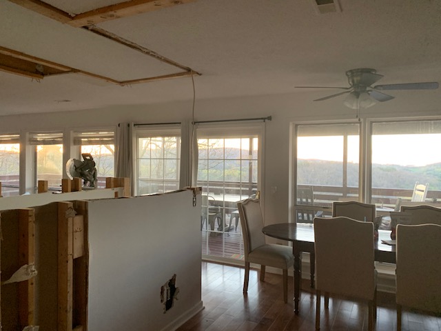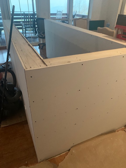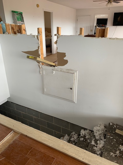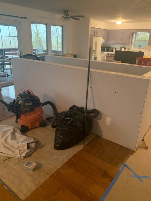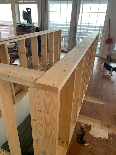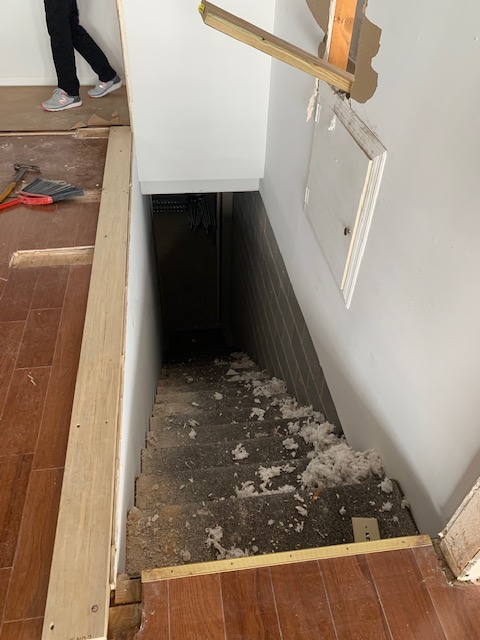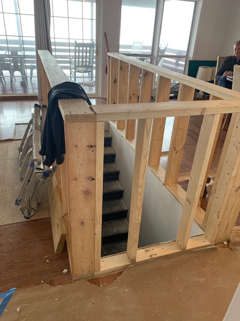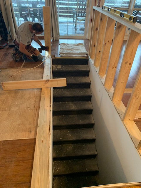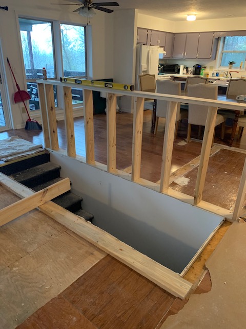 Hi everyone! This week has been crazy busy but we’ve gotten a lot accomplished and we are both very happy with our progress. I can’t wait for you to see what we’ve done! You may remember that when we left off last Saturday we had the big whoops of the shower door top being cut too short. Quick update on that – first thing Monday morning, Keith called Delta (the company that makes bathroom things, not the airline) and they are awesome and are sending a new top to our shower door. It will take 5-8 business days to arrive so we hope to see it this coming week. We enjoyed a few days at home relaxing and ordering food from our favorite local places and returned back to the mountains on Tuesday. Our handyman came Wednesday and brought a helper for 3 days. As we mentioned, we’re using Kevin (who is awesome by the way) to supplement things we don’t have time or the desire to do. He and his helper got a lot done this week! So let’s dive in and I’ll share with you the progress. Last week we had gotten the stairwell walls demoed. This week, Kevin was able to frame up the new stairwell surround and partially drywall it. Here’s a look at what was done.