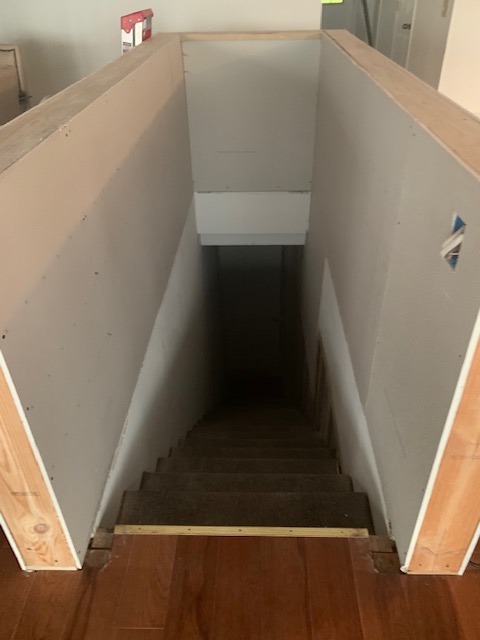 And finally, the newly drywalled stairwell down to the basement. Notice that we’ve also filled in the gaping holes in the ceiling with drywall.