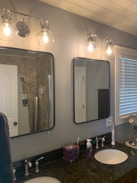 Now, let’s review what we have done in the past 4 1/2 weeks in the master suite. We have replaced the master bath vanity (turning it from 1 sink to 2), lights (going from 1 to 2) and mirrors (going from 1 to 2). Additionally, we’ve replaced all of the hardware, pulled off all of the old trim, put on new trim and painted. What’s left to be done is just the last few steps of the new sliding shower doors and replacing the doors to the linen closet and bathroom. I’m also dying to get to Home Goods and buy a decent trash can, tissue holder, etc. but that will wait. In the meantime, here you go!