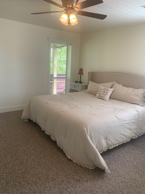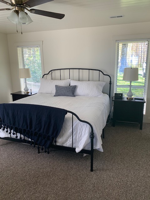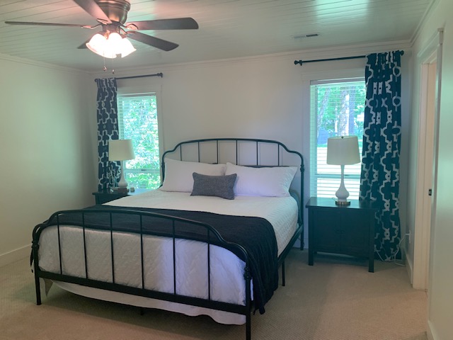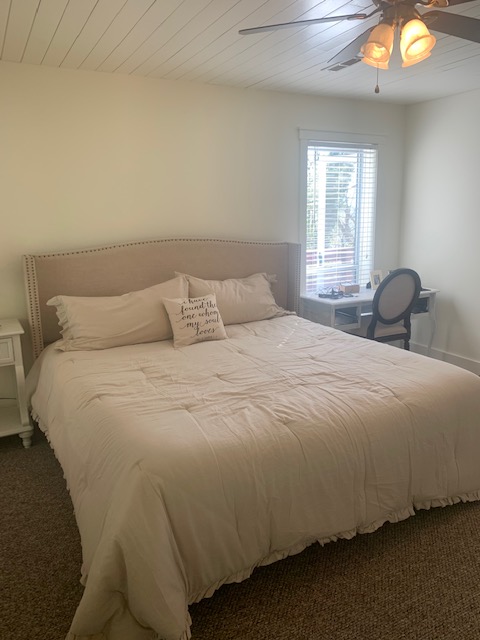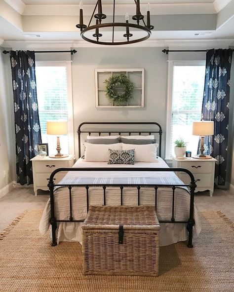 Now on to the bedroom. Again, I need to do some shopping but have been waiting for the stores to open again. I need a long bedskirt, window treatments, etc. but it’s perfectly livable as is. Here’s my vision for the master bedroom and then the actual bedroom as it is for now! The only thing we have left to do here is replace the doors and the carpet and put up the cove molding on the ceiling (which we will do this weekend if not before).