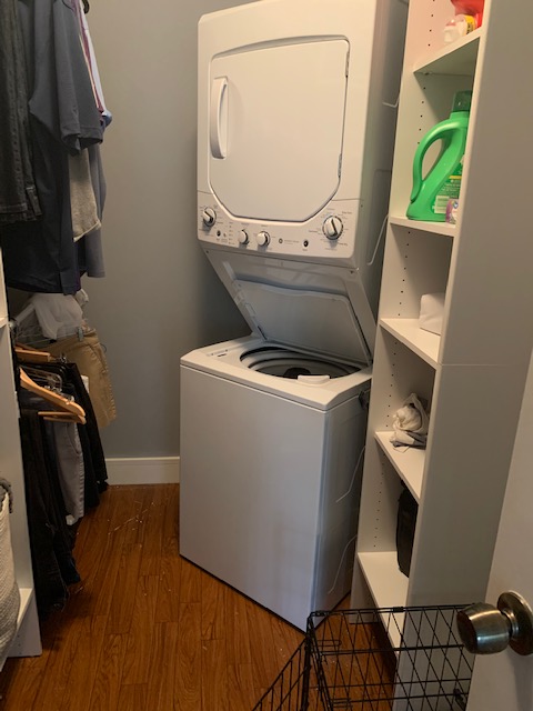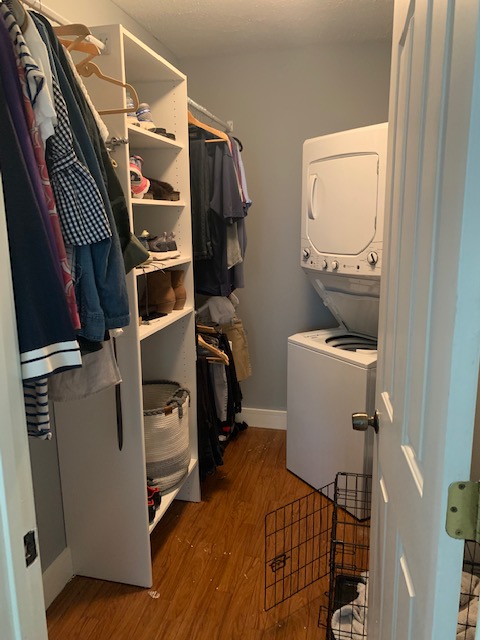 Next up is the master closet. If you remember, we demoed the laundry room and moved it into the master closet. It is definitely a little tight but works and was worth it to be able to open up the center of the house. Last time you saw the closet, it was drywalled but not finished. Here’s the finished product. One note – when we were putting in the laundry, we went on and ripped out the carpet from the closet. Underneath the carpet was vinyl which was a hardwood look, so that’s what you’re seeing. When we carpet the bedroom we will also carpet the closet. Oh – you may also see Chloe’s crate – the closet is also her bedroom here!