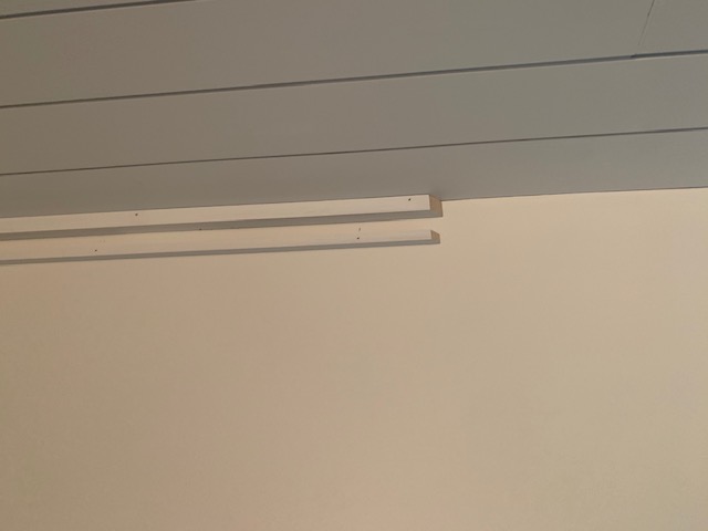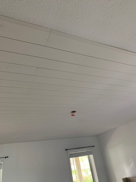 The guest room started getting the shiplap ceiling today, thanks to our handyman having some time to come back. He also wrapped up the drywall down to the basement and ripped up the carpet going down the stairs. When we repair the flooring where we demoed the center of the house, we’ll deal with those stairs. I’m still deciding how I want to handle those, so stay tuned for a decision on that soon!