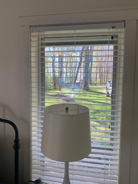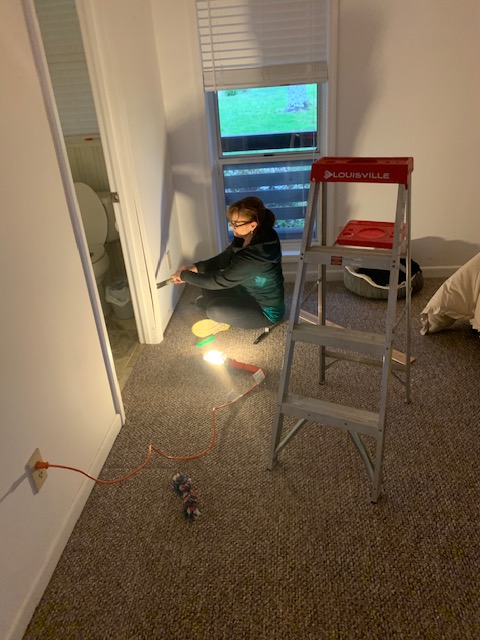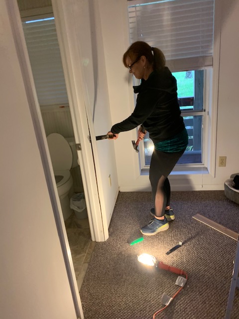We’ve also managed to get everything wrapped up in the guest room, affectionately known as the “Dot Suite” for my mom who has been quarantining with us! I only have one thing left to do and that is to paint the trim we put up on the ceiling. I’ll share those pictures with you next week. In the meantime, I know many of you think Keith does all the work around here, but I do a fair amount as well! I’ve included a couple of gratuitous pictures of me ripping out old trim after work (there was no overhead light at the time, hence the lamp). As you enjoy seeing the “new” room, please note that if you’re looking at my desk (the Dot Suite is also my home office when we are in the mountains), it is a work in process. With no progress made recently!!! The room is rather bland right now, but I hope to get some additional bedding and art work if I can ever find time to do some more shopping.