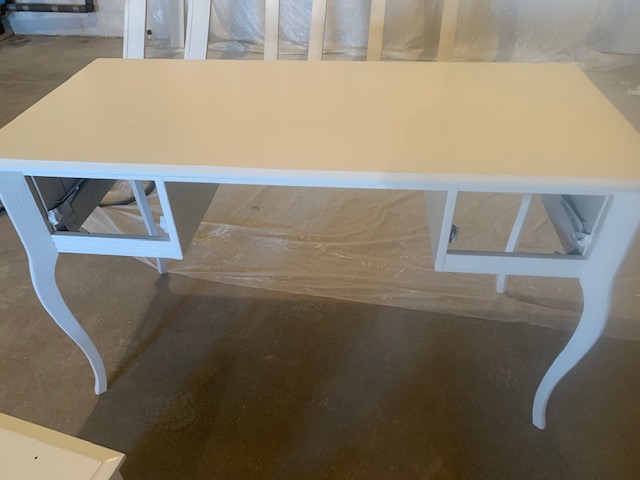 Last but not least, I was able to finally start working on my desk again. Because I’ve needed it to work my day job when we’re up here, I hadn’t had a chance to get back to painting it. I’ve been working on it in its primed state for the past two months and I finally had time to work on it. After sanding it, I started using my fancy paint sprayer which SHOULD have done a great job on it. Instead, it kind of looks like orange peel. Keith & I have played with the settings, read the instructions repeatedly, and we just can’t get it to work well. So, I may end up back with my little hand sprayer you hook up to the air compressor. You can see that I set up a spraying station in our unfinished basement.