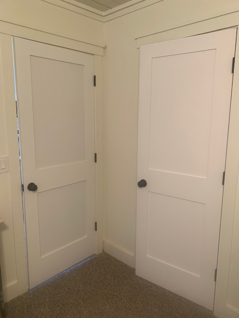 We had my aunt and uncle, our first visitors, up here this weekend, which was fun. My uncle earned his keep by helping Keith finish hanging the interior doors! You may remember that the first door took us a very long time to hang and Keith was probably ready to kill me for not buying pre-hung! Well, Keith (with some help from me) hung 2 doors on Friday and he and my uncle hung 6 on Saturday. They were in full beast mode and killed it! There are still a couple of door knobs to go in, but they’re on doors that I started painting. Take a look at how great the (unpainted) doors look!