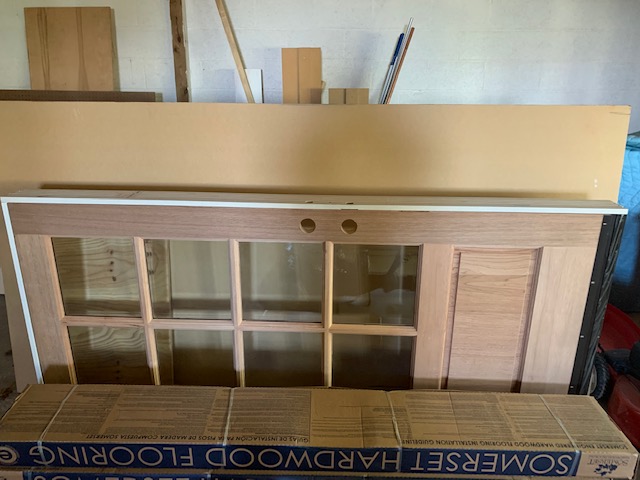 Back to doors. One of the things I spent considerable time on this weekend was our new front door. It is a gorgeous mahogany door, and we toyed with staining it. But it looked so pretty we decided to just put polyurethane on it. It was a lot of elbow grease to sand, poly, sand, poly, sand, poly! But it looks great. This isn’t a great picture of it, because of the glare, but you’ll get to see it up and in place on my next blog and I can’t wait!