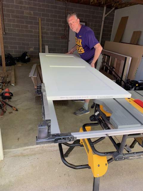 Keith used his fancy Kreg straight edge which rides on a sled (essentially a track saw) to trim up the bottom of the door. The length is what we did with the table saw.