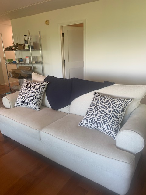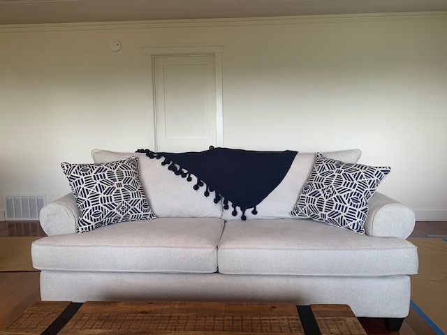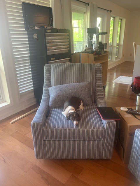 I hope everyone has had a restful Memorial Day weekend. I can’t say ours has been restful but I can say it’s been productive! We are finally getting things a little more organized and a little more homey, in spite of the fact that we’re still living in a construction zone. We had two couches and two chairs delivered a week and a half ago and it has made life a LOT more comfortable to be up here. We still have an Amazon box as an end table, a round ottoman that normally sits under my baby grand in Atlanta as our ottoman, etc. I’ve got a coffee table and end tables on order so those should arrive in the next couple of weeks and make it a little more cohesive looking. Here’s a peek at our den now. Note the lovely backdrop of the tool chest and the compound miter saw, but hey, this is a huge improvement, trust me!