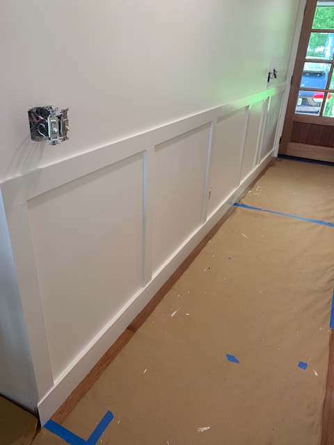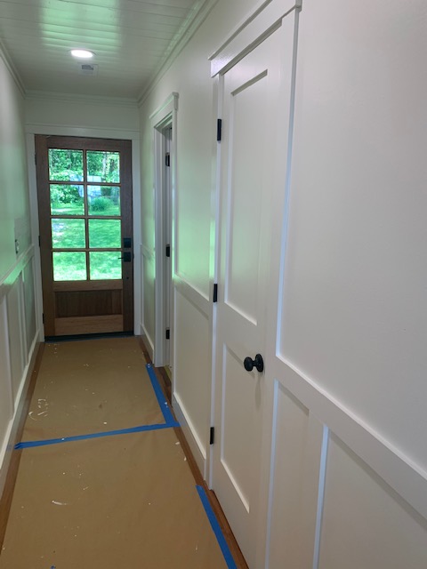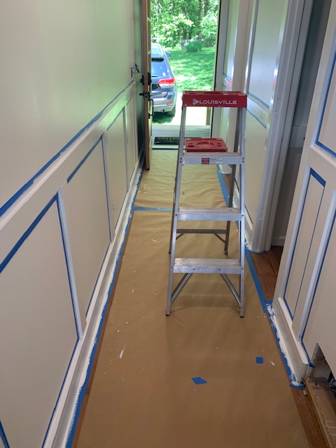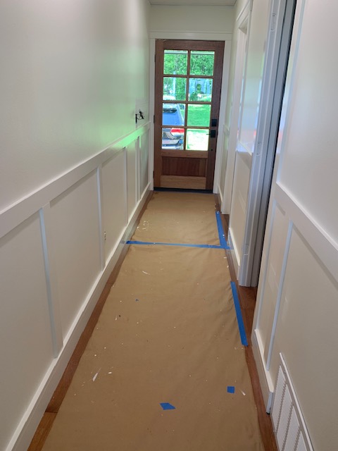 In between all of the coats of paint on the doors, I worked with Keith to finally dress up the long entrance hall which greets you from the front door. I had mentioned in my first blog that we wanted to add some board and batten to give the long narrow hall some interest. Last week we drew it out with pencil on the walls and agreed to how high and how far apart we wanted the boards. This weekend we brought that to life and milled, painted and put up all of that trim. That’s fairly time consuming but the result was so worth it. Once the trim was up, I was back to caulking until my fingers bled! Then it was time to tape and paint.