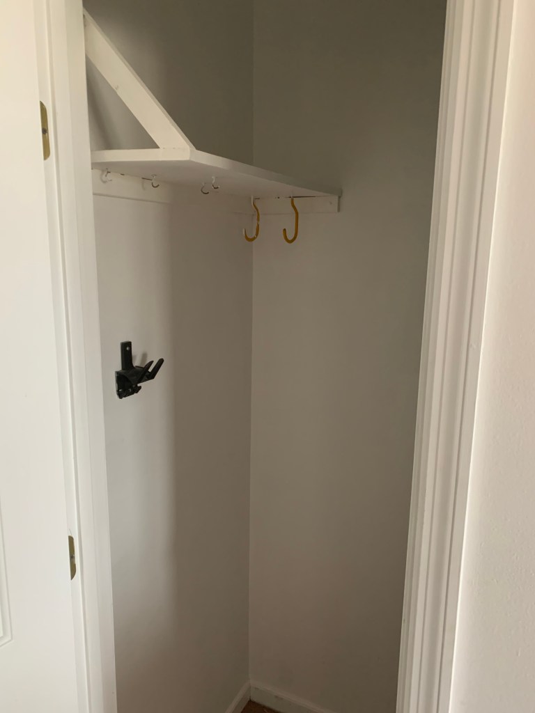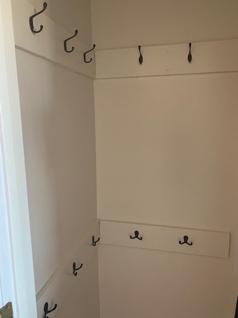 It was a simple but effective change to rip out the weird shelf thing and add a bunch of hooks to it. I think it looks fabulous for very little work or money! And now we can easily hang our coats up. Which will be key for the winters up there. It’s WINDY!
