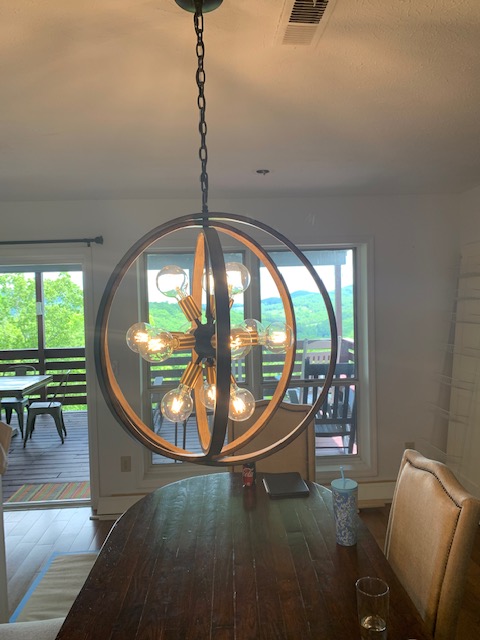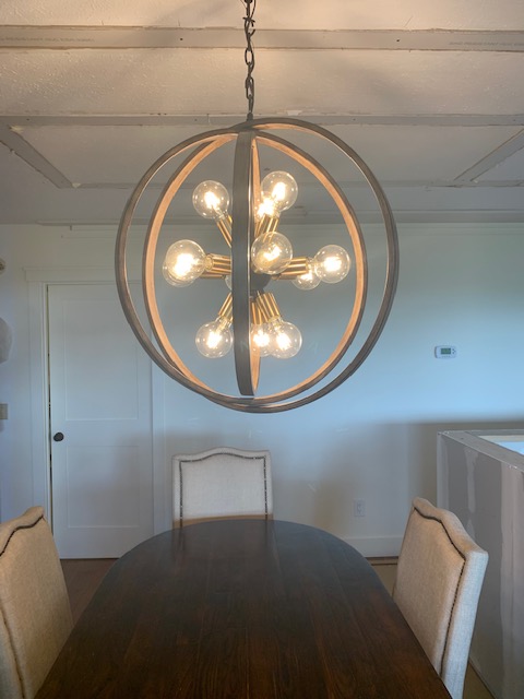 Thankfully Keith has excellent electrician skills and was able to use them for this. One other electrical bit of work he did while we were gone was to hang the new light fixture over our kitchen table. My sweet friend Anna gave us this light fixture she had bought and couldn’t use, so thanks Anna! We love it! We do need to shorten it a little bit but I think it looks amazing.