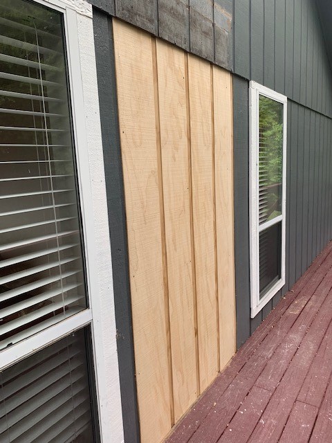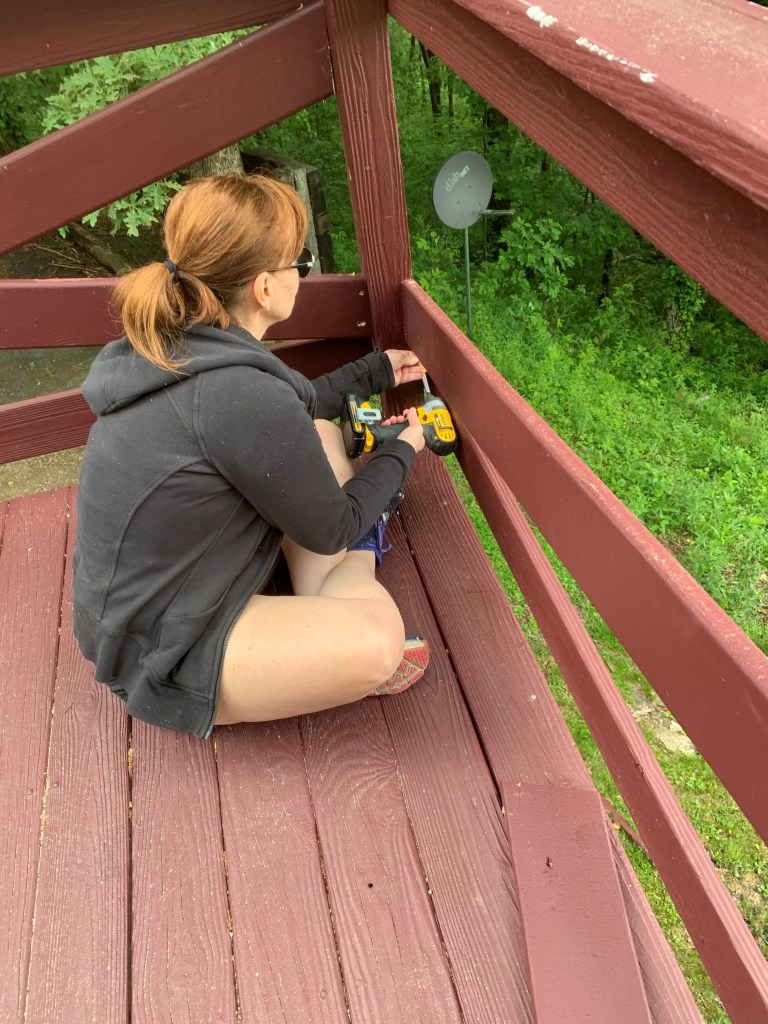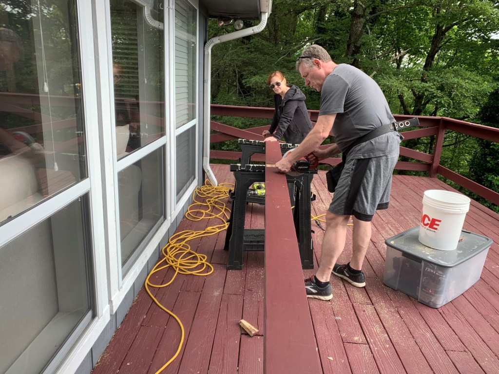 It was a little awkward to remove the big boards, especially as we moved around the house and the drop went from 3 feet to 20+ feet! It was a multi-step process. We removed the middle boards, measured, cut, dry fit, cut a second board, drilled pilot holes and screwed them in. Then rinse, repeat. None of the spaces between the posts were the same, so we had to do that each time. There are 21 spans, and we got 16 done today before it started sprinkling. We got a lot better as we went along, and it took less time. But we are so happy about how it looks! What do you think?