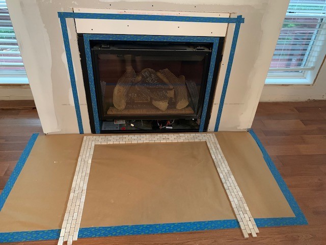 Now on to our other big project this week, the mantle. We aren’t quite done but we are super close. We just need to plane a few trim pieces and then we will wrap it up. But since our planer was in Atlanta and we weren’t, we will bring it back up with us for next weekend. Let’s start with the tiling. After watching about 5 minutes of YouTube videos, we were confident enough to start. We used premixed thinset which made it fairly easy. We measured and taped off the “lines” we wanted to stay within and we also placed a ledger board to make sure we kept our top line straight.