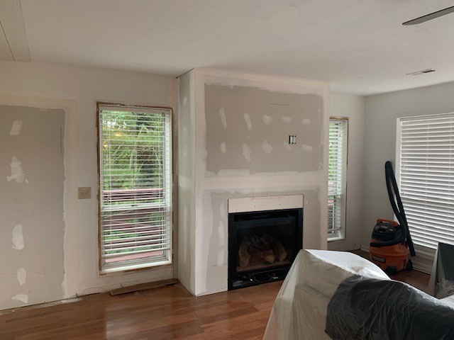 While we were driving back from BR, our handyman Kevin was busy drywalling the fireplace and closing up the superfluous side door. Our fireplace is now starting to look like a fireplace and I’m so happy to be rid of the side door! Take a look at it both from the inside and out!