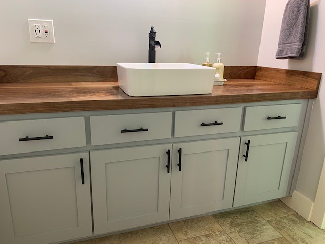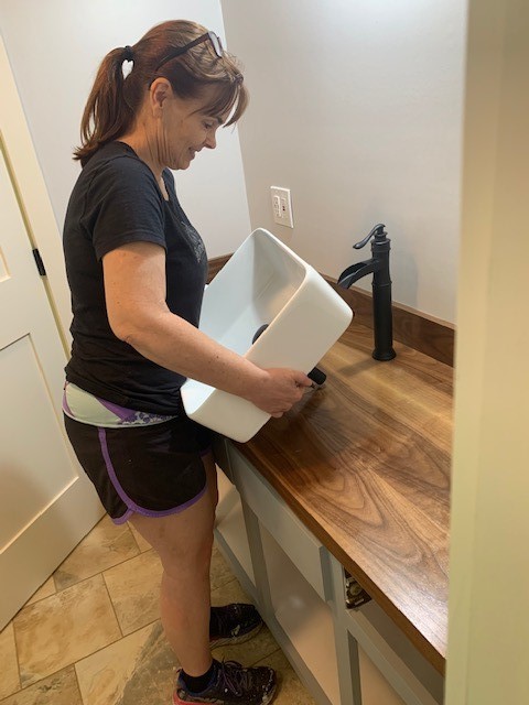 So far, we have taken down the mirror (more on that in a future blog), Keith has added two more outlets (there were only two to start with!?!?) and we raised the junction box for the new light fixture. It’s not so exciting so I won’t bore you with pictures of it, but I have been busy with drywall mud covering up all of the holes from the old towel bars and the giant hole from where we moved up the junction box for the light. While we wait on that to dry and get perfect, we stayed busy working on the vanity.