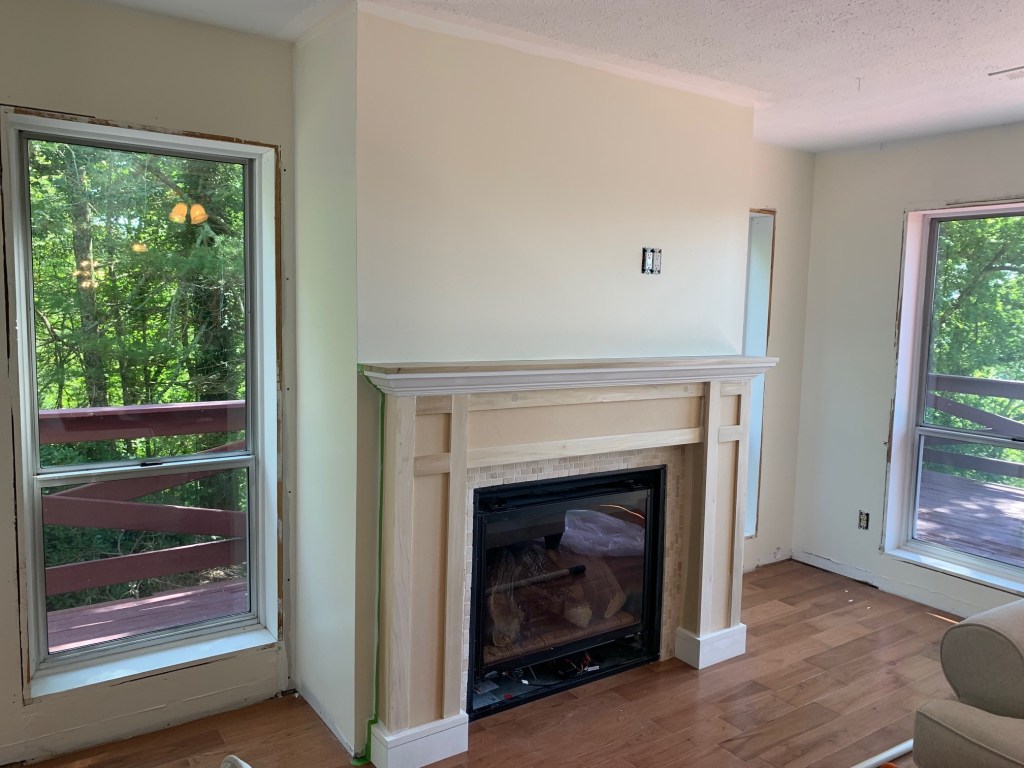 When we wrapped that up, we had a fun surprise visit from the Robinsons from whom we bought the house! It was so great to see them and see their reactions to all of the changes we’ve made in the past 10 weeks. We had a great visit and hope to see them again really soon. They have bought a house “in town” in Highlands so they’re not too far away. After they left we did a little more trim around the entrances to the bedrooms (we had done the trim inside the room but not outside) and then called it a day and headed back to Atlanta. When we go back up later this week we’ll wrap up the trim along the bedroom walls and in the hall, paint the ceilings and then get to working on our fireplace. I’ll tell you a lot more about that next week but here’s a sneak peek at the prep work being done for our new fireplace!
