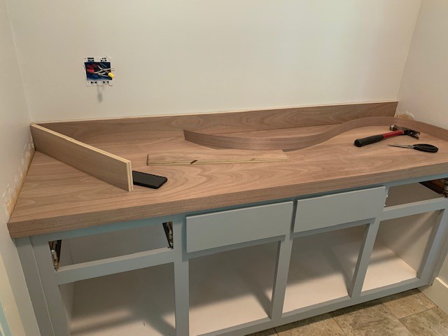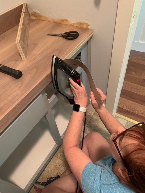 Once we decided to do replace the cabinet doors with our own, we had to figure out what to do with the ugly countertop. I did a fair amount of research and we decided to make our own countertop using walnut plywood and edge banding. You don’t know what edge banding is? Well, I had used it during a woodworking class I took back when I lived in Chicago, so I had a tiny bit of experience with it. So let me show and tell you a little bit about our countertop. We started with a 2’x8′ piece of plywood and cut it to the right length. Then we placed it on top of the old vanity top plywood after pulling off the formica (it’s just a thin layer). Once we did that, we cut our edge banding to length and used a hot iron to glue it to the edge of the two pieces of plywood. Then our plywood looked like a solid piece of walnut!