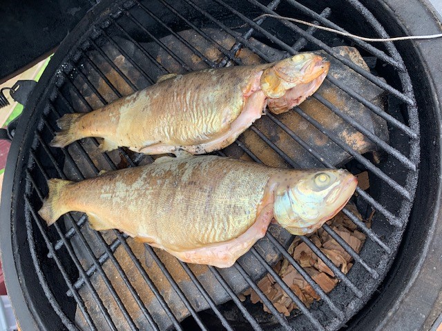 In between building the columns of the mantle and the top of the mantle, we took a little break to go fishing. There’s a little trout pond about 3 minutes from our house, so we decided to go check it out. Well, it was us and a bunch of 3-10 year olds with their parents out fishing! Haha! We each caught one and were so excited to make this be our dinner. We brought them home, brined them and smoked them on the Egg.