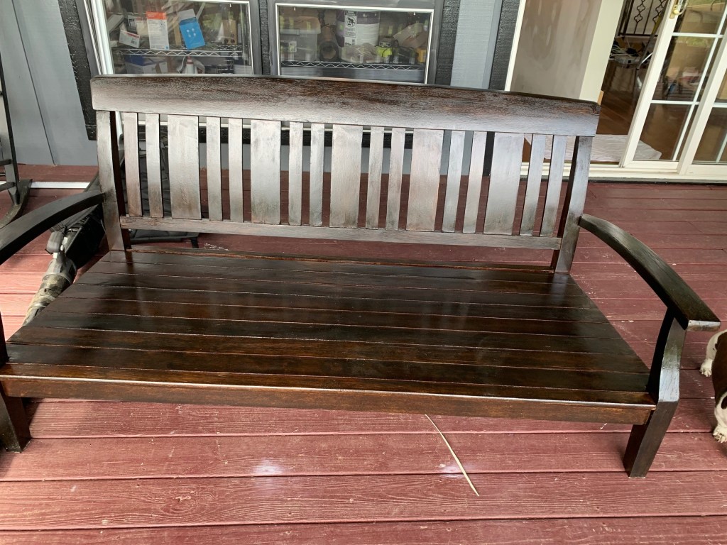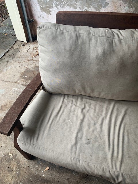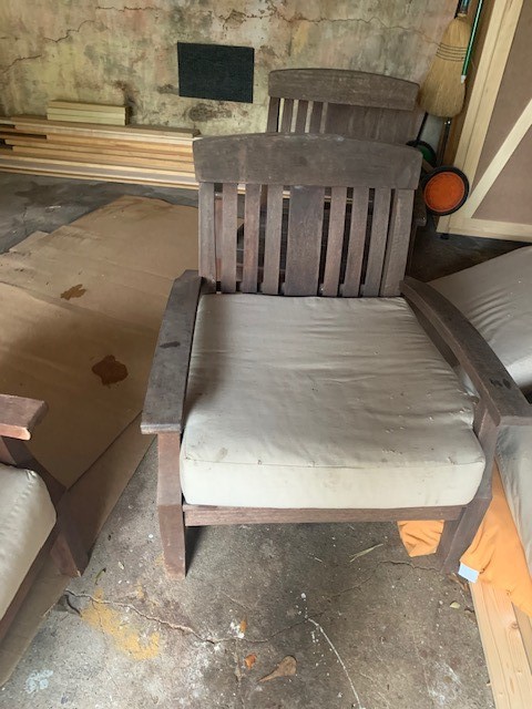 From those pics, you’d think that maybe a quick coat of polyurethane and recovering or replacing the cushions would do it, right? That’s what I thought too. Well, here’s the reality of what I got…