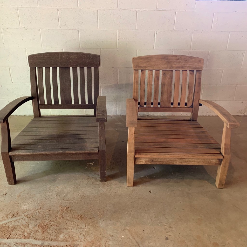 So then it became time to turn lemons into lemonade. I had the cushions recovered (for Atlanta friends, I used Fast and Great Upholstery on Howell Mill and they did a great job for the most reasonable price I could find). While they were working on the cushions, I started sanding and sanding and sanding and sanding. Here’s a look at one sanded and one unsanded chair just so you get a feel for it.