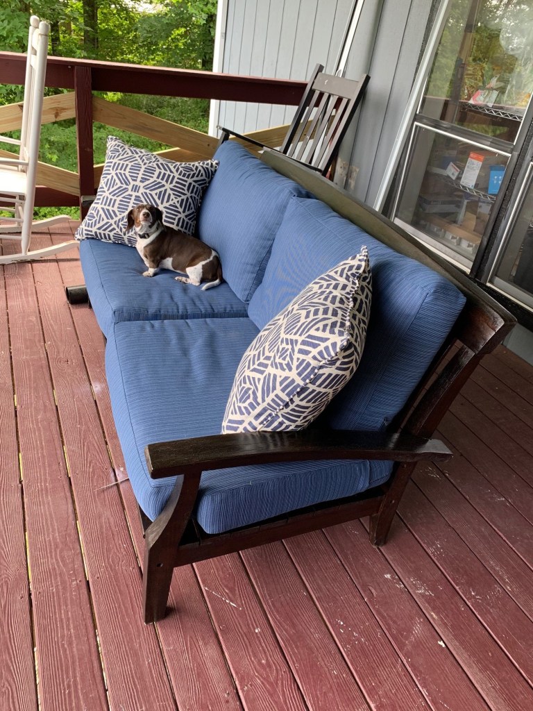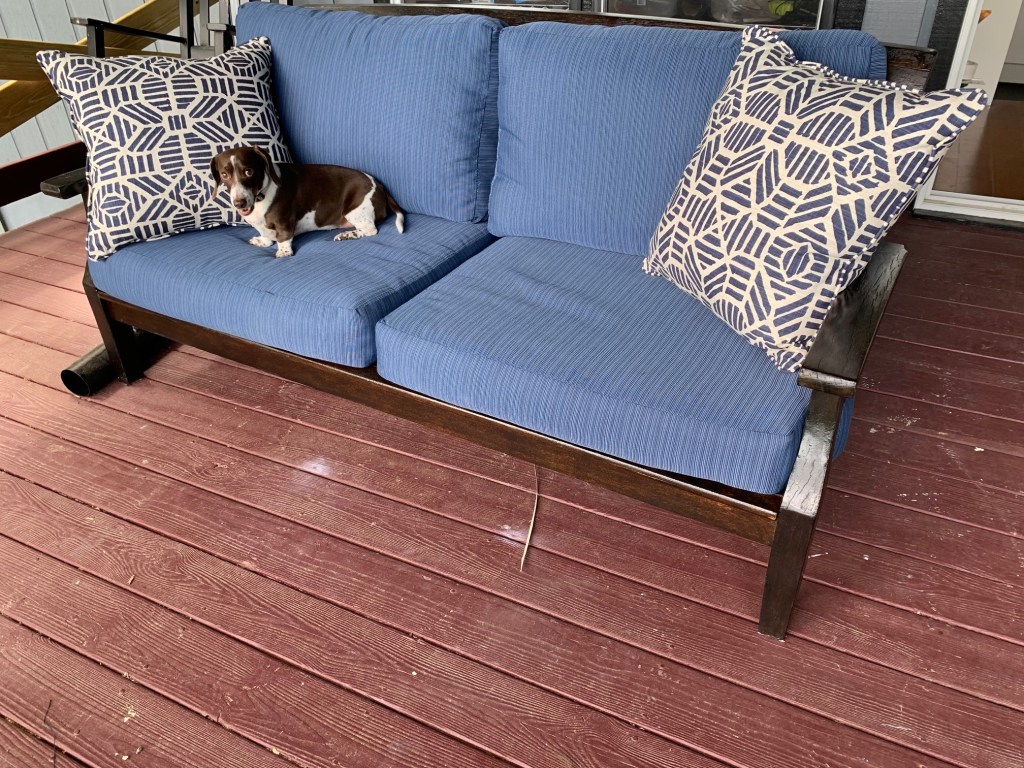 Last but not least is outdoor furniture. Initially I wanted to just build some outdoor furniture, but then found some used Restoration Hardware furniture on Facebook Marketplace. I pretty much bought it sight unseen and when I got it, it was in a bit worse shape than I imagined. I knew the cushions were GROSS and in bad shape, but the actual furniture took a bit more work than I initially counted on. But, after working on and off the past several weeks, I finished up the sofa and we finally sat outside on it last night! We haven’t had anything other than some rocking chairs which are too tall for my short legs, so I didn’t have any comfortable seating until now. I still have to finish up the two chairs (one is sanded and ready to be stained and sealed and the other hasn’t been started), but here goes! Let’s start with the picture that I saw on Marketplace…
