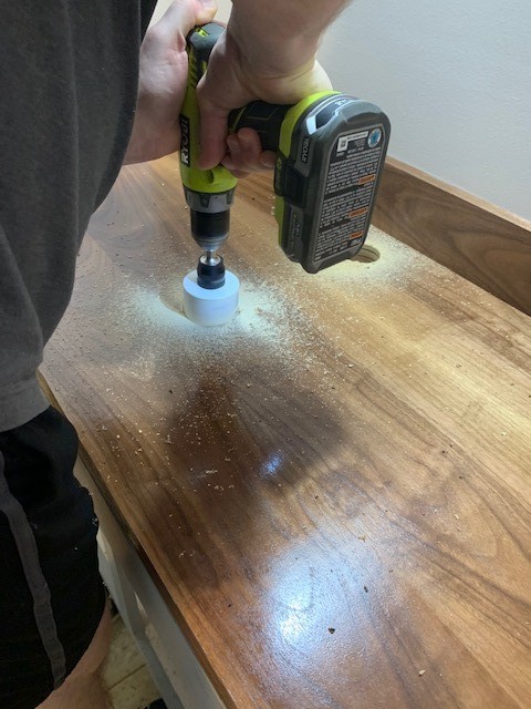 Once we had this in place and put the backsplash on with the edge banding, I sealed it with three coats of exterior grade polyurethane. After that dried completely, it was time to cut holes for the sink drain and the faucet and install them.